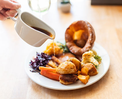 nut roast, all carved fresh and served with roast potatoes, Yorkshire pudding, seasonal vegetables and a
